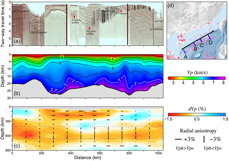 图1南海北部(a)多道地震反射数据、(b)深度学习生成的三维地壳模型、以及(c)远震各向异性层析成像地幔模型的垂直剖面。(b)、(c)中背景颜色分别代表P波速度(Vp)和扰动值(dVp)。(d)中黑色线段指示了剖面位置。(c)中水平和竖直短线分别表示P波径向各向异性正值(水平Vp>垂直Vp)和负值(水平Vp<垂直Vp),短线长度表示幅值。(d)中粉色区域指示了晚新生代玄武岩分布。