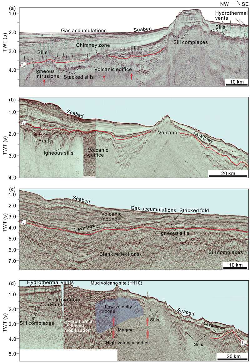 图3南海北部的多道地震反射剖面。(a-d)对应图1d中的A-D剖面。该图显示了海底火山、岩床、熔岩流和热液喷口的分布,注意到在火成岩侵入体上方出现了气体聚集、烟囱状区和沉积物变形。T60(红色曲线)对应于下中新统地层的底部。