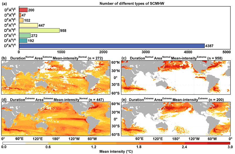 1982-2022年全球共有6605个SCMHWs被识别,其中DNAEIN,DNANIE,DEAEIN和DEAEIE型发生频繁,强度较高的区域主要出现在西边界流及其延伸体区域、厄加勒斯溢流区、赤道中东太平洋区域等(图2)。值得注意的是,平均强度处在高风险等级的类型(图2(c)和2(e))仅在上述特定区域出现,这可能与涡旋活动密切相关。此外,研究还发现SCMHWs多数沿东西方向移动,且在过去几十年中呈现频率增加、持续时间延长、覆盖范围扩大、移动距离增加但移动速减慢的变化趋势。