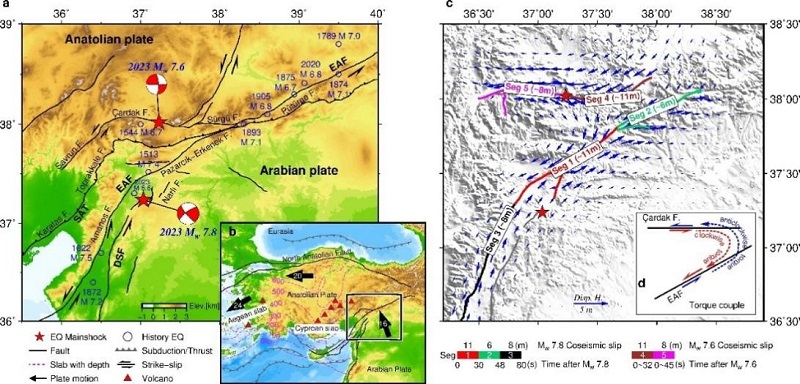 土耳其地处复杂的板块边界,东安纳托利亚断层(EAF)和死海断层(DSF)在此交汇,使得该地区地震活动频繁。2023年2月6日,该地区在9个小时内发生了两次7.6级以上大地震,造成了巨大的人员伤亡和财产损失,引发全球关注。然而,其双震发震机制一直未被明确。