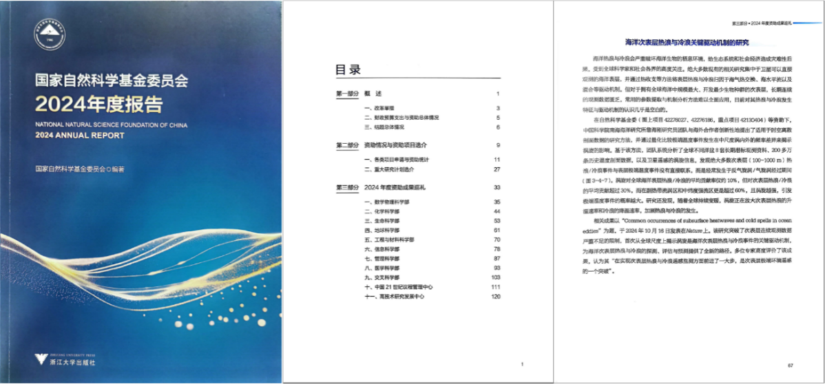 近日,国家自然科学基金委发布了《国家自然科学基金委员会2024年度报告》。该书全面介绍了国家自然科学基金2024年度各类项目申请、资助与结题情况,集中展示了以自然科学基金委为资助主体的重大研究计划和优秀资助成果。中国科学院南海海洋研究所热带海洋环境与岛礁生态全国重点实验室、广东省海洋遥感与大数据重点实验室(LORS)何庆友研究员的研究成果“海洋次表层热浪与冷浪关键驱动机制”成功入选2024年度资助成果巡礼。这是该年度地球科学部入选的6项成果中唯一的海洋科学领域研究成果。
