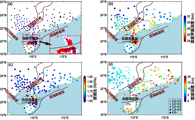 研究结果显示,北部湾盆地区域的地壳厚度普遍小于26 km,平均波速比(Vp/Vs)高于1.80,LAB埋深较浅且界面处存在明显的波速突变。此外,该区域地震活动表现出震源深度增大的特征。这些特征表明,北部湾区域的岩石圈结构经历了显著的改造过程,推测地幔上涌可能是主要的动力学机制。在此过程中,地幔物质向上运移并导致部分熔体在岩石圈底部堆积,一方面通过岩浆作用改变了地壳结构和物质组成,形成晚新生代玄武岩;另一方面,这种深部过程还可能通过改变区域应力状态而影响地震孕震机制,导致震源深度增加。该研究为深入理解板内岩石圈变形及壳幔相互作用机制提供了重要的科学依据。