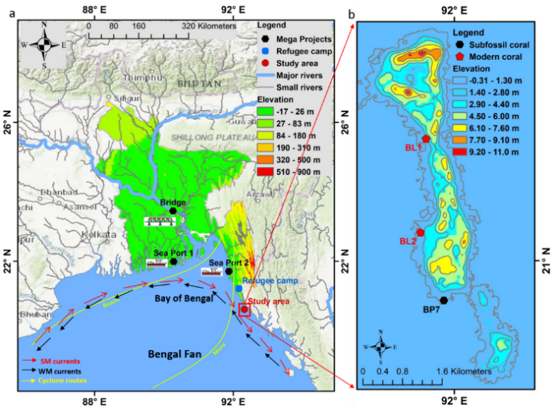 图1 (a)显示圣马丁岛、罗兴亚难民营以及包括帕德玛大桥(Bridge)、巴伊拉海港(Port1)和马塔尔巴里深海港(Port2)在内的三个大型项目的地理位置;(b)沿岛屿的珊瑚采样点。