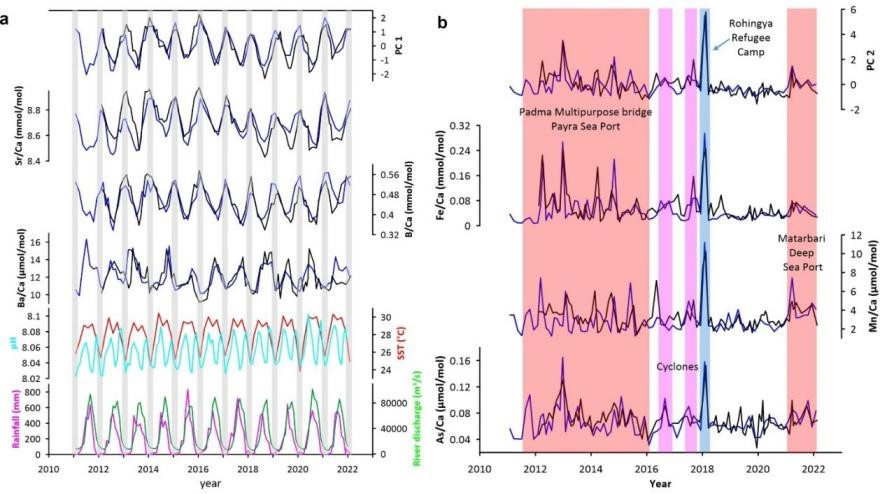 本研究通过分析来自孟加拉国圣马丁岛的珊瑚骨骼,追踪了2011年至2022年期间的月分辨率的微量元素波动,并将其与公元132年的亚化石珊瑚进行了比较。研究发现,现代珊瑚样本中的微量元素水平显著高于亚化石珊瑚,表明近几十年来人类活动对该地区的环境产生了深远影响。具体而言,与基础设施建设(如帕德玛大桥、巴伊拉海港和马塔尔巴里深海港)以及罗兴亚难民营建设的相关时间段内,珊瑚骨骼中的铁(Fe)、锰(Mn)和砷(As)含量显著增加。此外,磷(P)、锌(Zn)和镉(Cd)的长期增长趋势与农业化肥使用的增加密切相关,而锡(Sn)含量的上升则可能与防污剂、农药使用以及旅游业的发展有关。通过主成分分析(PCA)和多元线性回归(MLR)分析,研究团队进一步量化了人类活动对微量元素动态变化的贡献,结果显示人类活动大约占到了微量元素变异性的70%,表明人类活动在改变孟加拉湾微量元素分布方面发挥了主导作用。