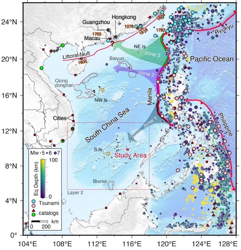 图1 南海及周边地震和历史海啸事件分布。带颜色的箭头区域展示马尼拉俯冲带不同区段海啸波的能量传播方向