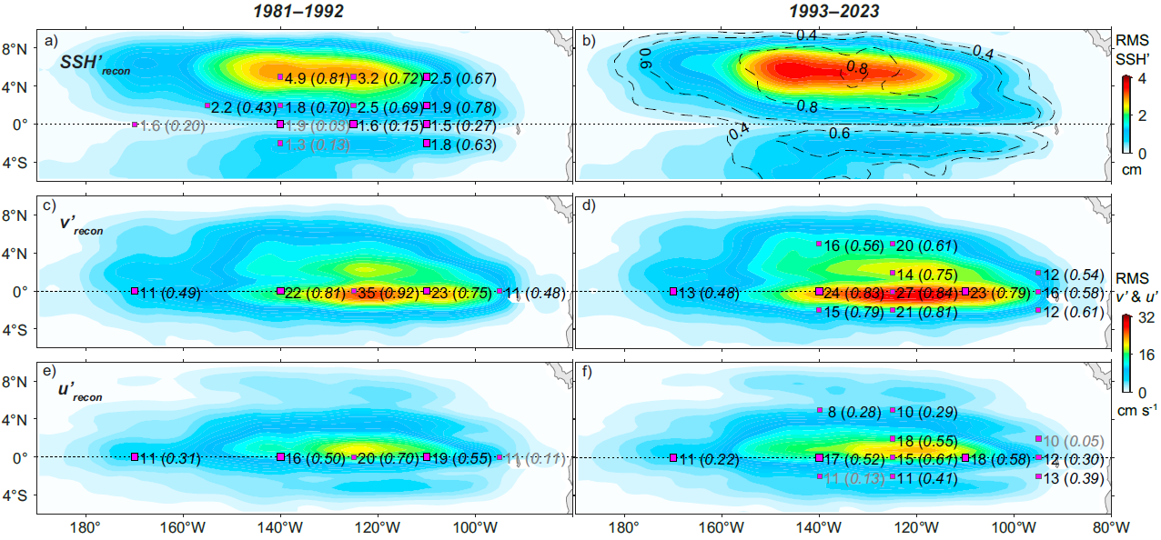 a,b) 1981-1992年(左)和1993-2023年(右)重建的海面高度异常(SSH');c,d) 重建的经向流速(v');e,f) 重建的纬向流速(u')。洋红色方块代表TAO观测浮标位置,数值标注代表观测值的均方根及与重建数据的相关系数(括号内部,黑色表示通过1%显著性检验),虚线等值线(b)代表重建数据与AVISO卫星高度计数据的相关系数。