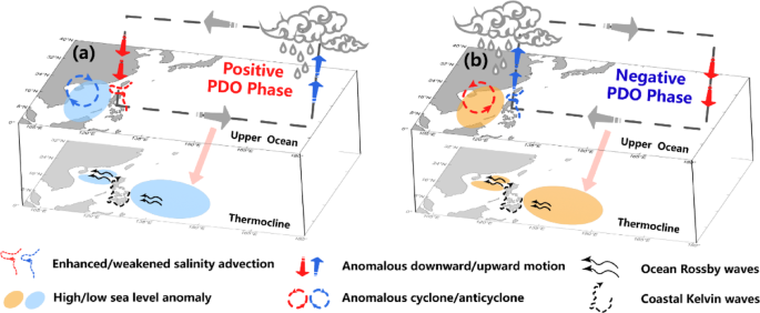 基于这些结果,本研究给出了南海海平面年代际变化的完整示意图(图3)。在PDO正(负)位相期间,赤道西太平洋出现西风(东风)异常,伴随着Walker环流的异常下降(上升)支和南海的反气旋(气旋)海表风异常。对于温跃层过程,赤道西太平洋异常风场产生西向传播的上升(下沉)Rossby波,在菲律宾近海转化为沿海Kelvin波,导致南海温跃层变浅(加深),水柱热含量降低(增加),TSLA降低(升高)。对于上层海洋过程,南海的反气旋(气旋式)海表风异常对应于蒸发增加(减少)和降水减少(增加),与PDO引起的黑潮入侵引起的盐度平流增强(减弱)相结合,导致高(低)盐度异常,导致低(高)HSLA。TSLA的变化主要反映在温跃层上,而HSLA的变化主要反映在表层海洋。HSLA和TSLA的变化共同构成了南海海平面的年代际变化。本研究完善了南海海平面年代际变化的机制,突出了盐度在区域海平面变化中的重要作用,有助于提升海平面模型和预测的准确性,并增强我们在评估沿海脆弱性、支持政策决策以及指导适应性战略制定方面的能力。