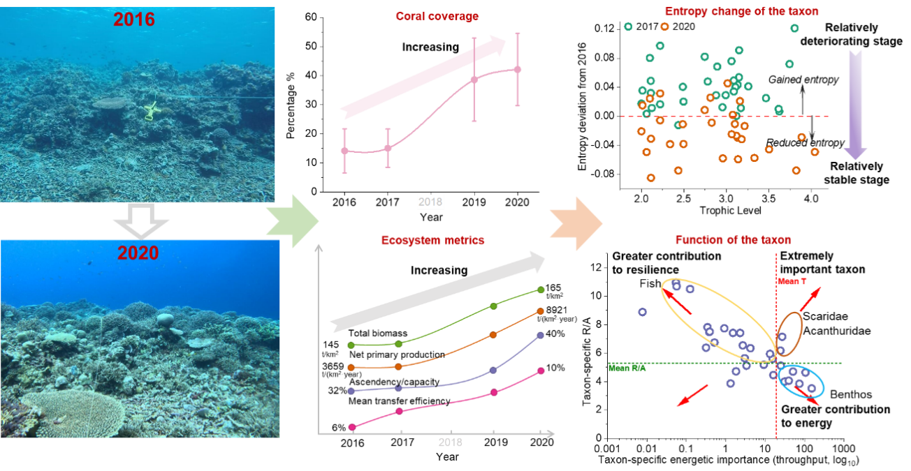 研究团队以南海典型珊瑚礁生态系统为对象。该区域在遭受极端气候事件严重干扰以后,于2016-2020年期间显现出自然恢复趋势,为研究珊瑚礁恢复过程中生态结构与功能的协同机制提供了难得的理想场景。本研究基于调查数据构建生态网络模型,从生态系统水平和类群水平定量解析能量流动格局及其时空变化,探讨能量分配、生态冗余性与系统恢复力之间的内在关联。