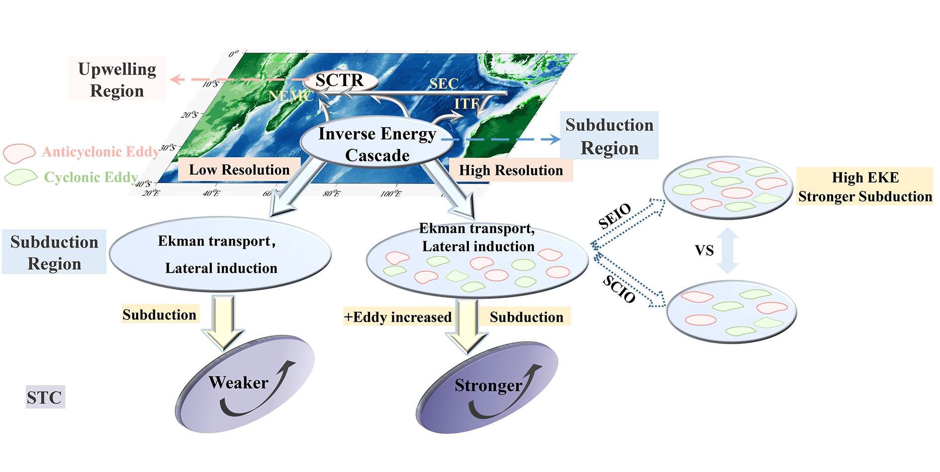 图1. 高低分辨率模式模拟潜沉区域示意图。潜沉区主要由风场驱动的Ekman输运形成,这一过程可以在低分辨率模式中模拟出来。然而,该区域也为高涡动能区域,且存在明显的逆向能量级联现象,这仅能在涡分辨率模式中被捕捉到。同时,涡分辨率模式更准确地再现了低位涡水潜沉的强度,特别是亚热带东南印度洋(SEIO)与亚热带中南印度洋(SCIO)之间的差异,也进一步增强了对浅层经向翻转环流强度的模拟。