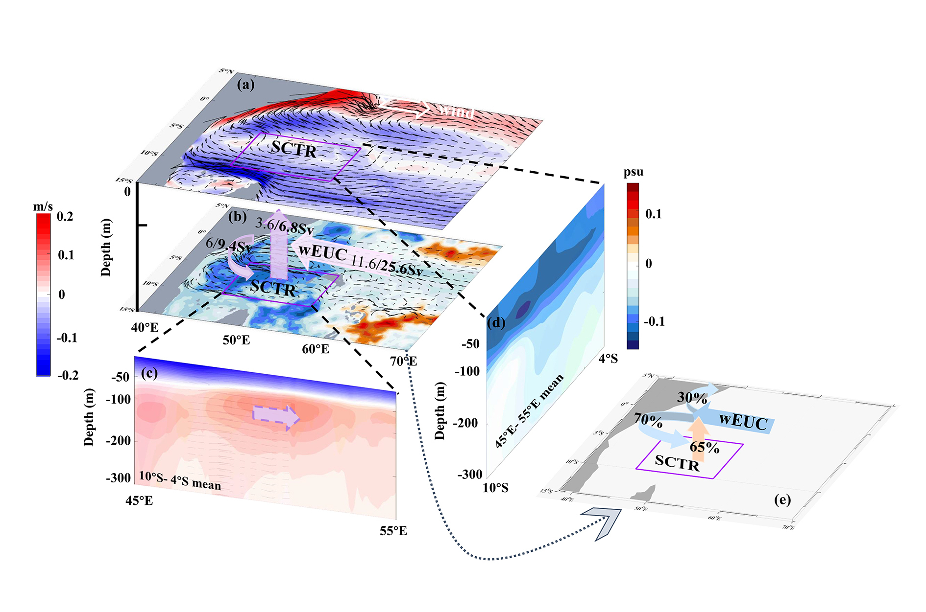 图2. wEUC为SCTR上升流提供水源的示意图。(a)nIOD年份平均表层流速(颜色表示纬向流速,矢量表示流场)。(b)nIOD年北半球夏季次表层的盐度异常及流场。蓝色区域表示因较强wEUC引入的低盐度水体。普通字体和加粗字体分别表示气候态和nIOD年份的输运量。(c)nIOD年北半球夏季SCTR区域内上层300米的平均纬向流速。(d)nIOD年份北半球夏季SCTR区域的盐度异常。(e)wEUC和SCTR上升流主要路径的示意图。约70%的水团向南输送,其中约65%上升至上层海洋。