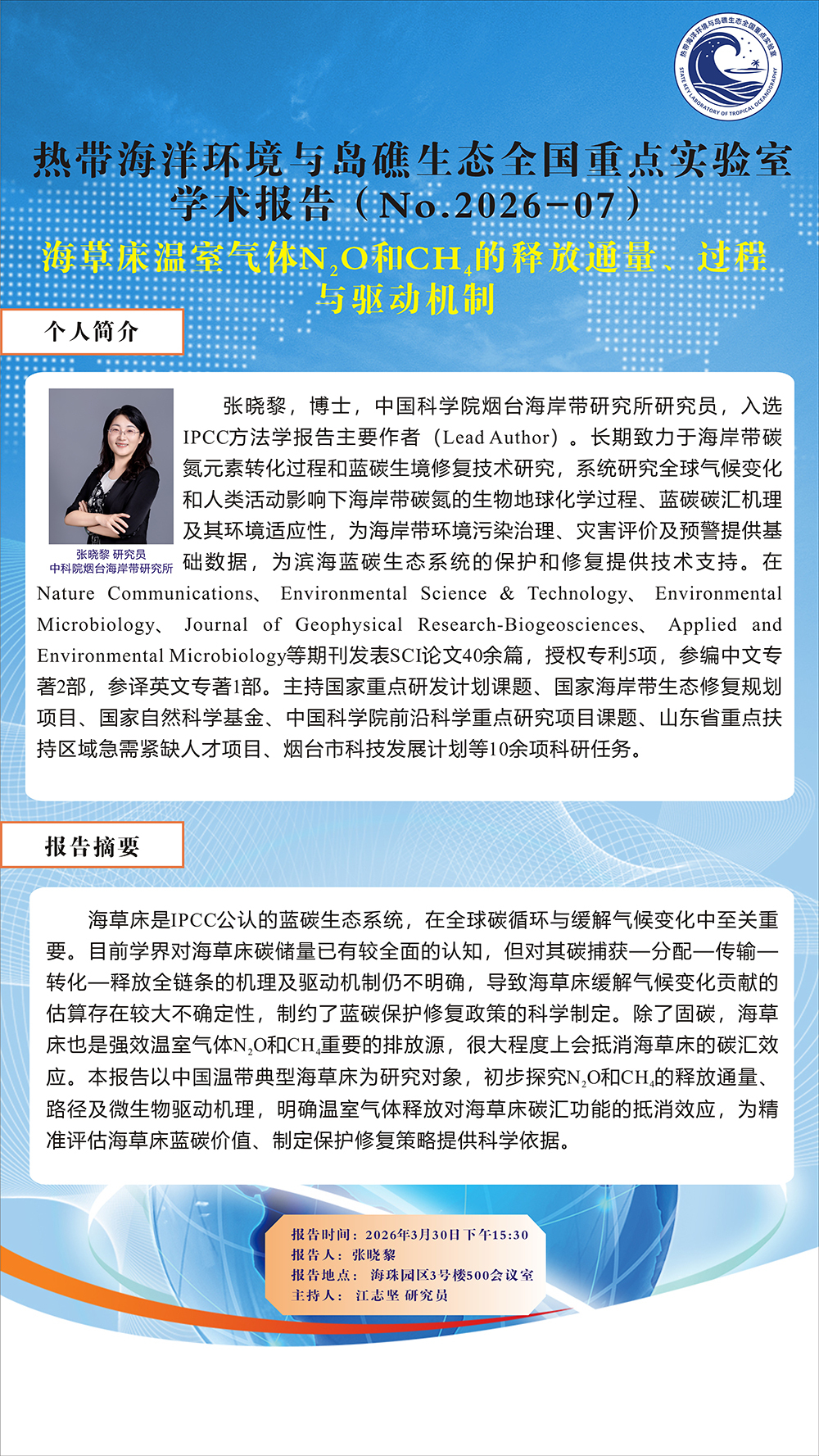 【摘要Abstract】:海草床是IPCC公认的蓝碳生态系统,在全球碳循环与缓解气候变化中至关重要。目前学界对海草床碳储量已有较全面的认知,但对其碳捕获—分配—传输—转化—释放全链条的机理及驱动机制仍不明确,导致海草床缓解气候变化贡献的估算存在较大不确定性,制约了蓝碳保护修复政策的科学制定。除了固碳,海草床也是强效温室气体N2O和CH4重要的排放源,很大程度上会抵消海草床的碳汇效应。本报告以中国温带典型海草床为研究对象,初步探究N2O和CH4的释放通量、路径及微生物驱动机理,明确温室气体释放对海草床碳汇功能的抵消效应,为精准评估海草床蓝碳价值、制定保护修复策略提供科学依据。