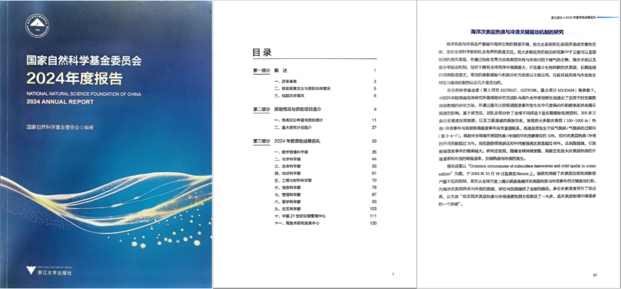 近日,国家自然科学基金委发布了《国家自然科学基金委员会2024年度报告》。该书全面介绍了国家自然科学基金2024年度各类项目申请、资助与结题情况,集中展示了以自然科学基金委为资助主体的重大研究计划和优秀资助成果。中国科学院南海海洋研究所热带海洋环境实验室(LTO)、广东省海洋遥感与大数据重点实验室(LORS)詹海刚研究员团队的研究成果“海洋次表层热浪与冷浪关键驱动机制”成功入选2024年度资助成果巡礼。这是该年度地球科学部入选的6项成果中唯一的海洋科学领域研究成果。